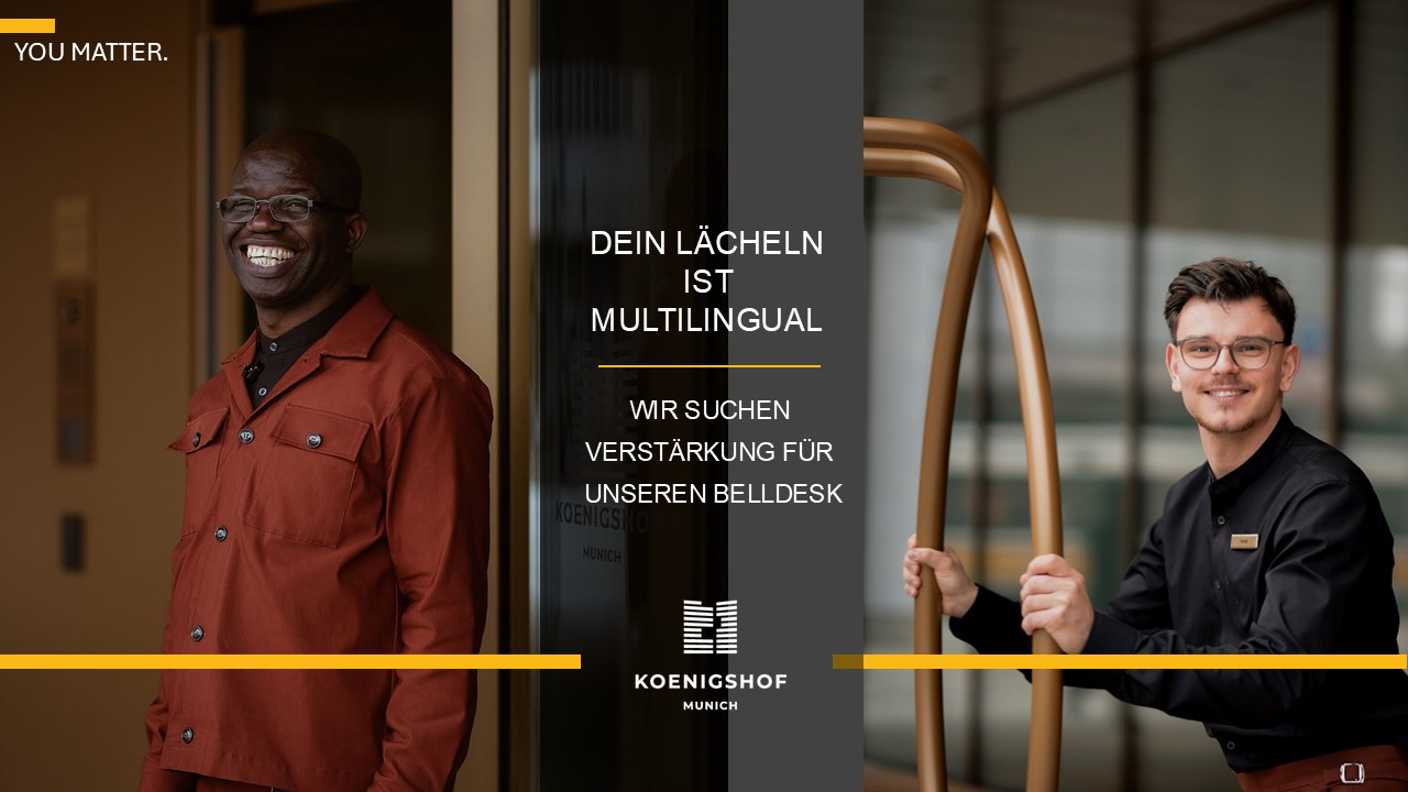 Für unsere Gäste aus aller Welt bist du der erste Willkommensgruß des Hauses! Du stellst den ersten Kontakt her! Du hast ein Gespür für das Wermitwem. Du hast ein Feeling für das Werwillwas und bist ein Teamplayer, um die Wünsche des Gastes zu erfüllen. Dein Lächeln heißt unsere Gäste "Herzlich Willkommen im Koenigshof Munich". Du öffnest ihnen die Tür zu unserem Haus, hilfst mit dem Gepäck, begleitest sie auf ihr Zimmer und erleichterst ihnen den Tag. Du informierst dich über die Münchner Kultur und kennst die schnellsten Taxis der Stadt. Du bist der erste Kontakt und das letzte „Auf Wiedersehen & bis zum nächsten Mal“!